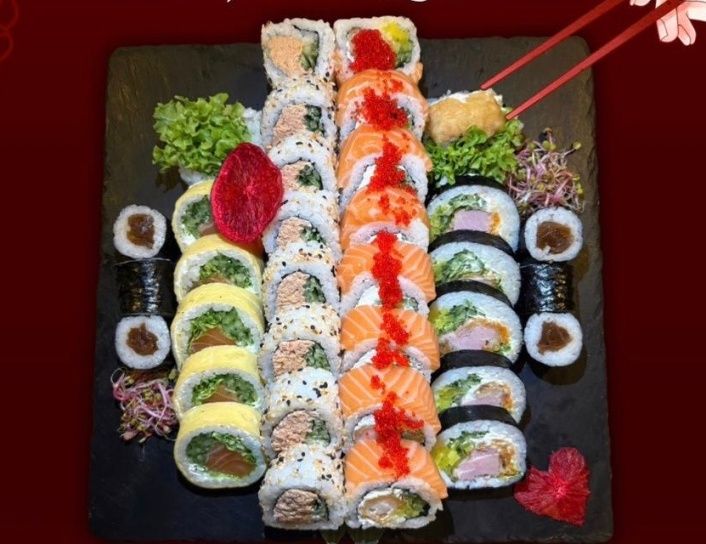 paluszek krabowy, serek, ogórek, obłożona naprzemiennie łososiem, awokado, tuńczykiem, rybą maślana, krewetką gotowana